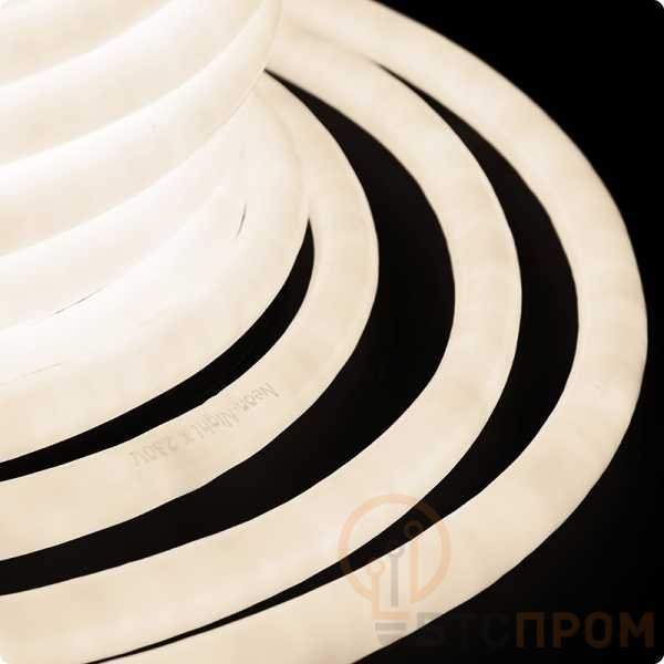 Гибкий неон - световой шнур выполненный из матовой тепло-белой ПВХ трубки с токопроводящими жилами и светодиодами внутри. Используется для декоративной и архитектурной подсветки объектов, так же широко распространён в украшении интерьера. Шнур имеет два токопроводящих провода внутри и используется в режиме постоянного свечения. Данный вид гибкого неона имеет угол свечения 360 градусов благодаря равномерному расположению светодиодов внутри ПВХ трубки. Гибкий неон поставляется в бухтах длиной 50 м, имеет модуль резки 0,78 метра. Следуя несложной инструкции легко можно отрезать и подключить гибкий неон нужной длины. Температурный диапазон использования от -45 до +35 оС, монтаж необходимо производить при температуре -25 до +35 оС. Допустимый диаметр изгиба составляет 3 см.При подключении гибкого неона к соединительному разъему (муфте) необходимо заизолировать свободное воздушное пространство соединительного разъема (муфты) морозостойким силиконовым герметиком, предотвращающим попадание влаги. Сверху данного соединения необходимо использовать термоусаживаемую трубку.