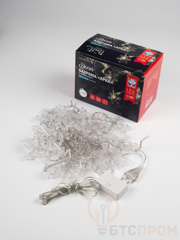 Гирлянда Бахрома "Арка" ICLD136W-C-SF (артикул 4690601054272) предлагает аналогичную конструкцию арки размером 2.5х1.2 метра со 136 светодиодами, но с нейтральным белым светом (W). Нейтральный белый свет (около 4000К) является более универсальным и функциональным – он лучше подходит для освещения коммерческих помещений, витрин, офисов или современных интерьеров, где важна точная цветопередача и отсутствие желтого оттенка. Насадки в форме снежинок (SF) придают гирлянде зимнее, новогоднее настроение. Восемь режимов работы сохраняют все возможности динамического освещения. Такой вариант арки будет прекрасно смотреться в торговом центре, на корпоративном мероприятии или в интерьере, выполненном в холодной или нейтральной цветовой гамме.
