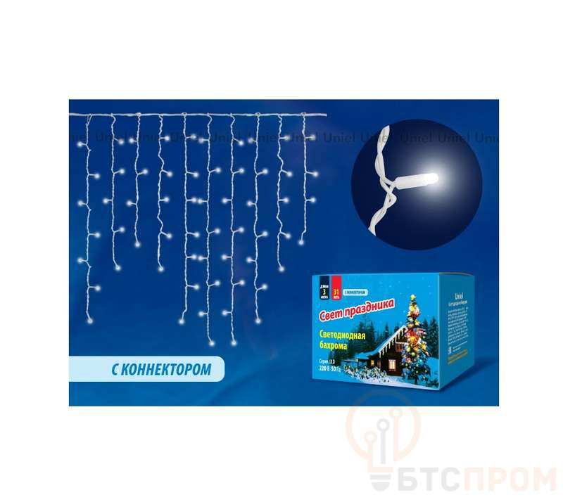 Гирлянда "Бахрома" светодиодная ULD-B3010-200/SWK BLUE IP67 со статическим свечением 3м соединяемая 200 светодиодов син. провод бел. Uniel UL-00002329