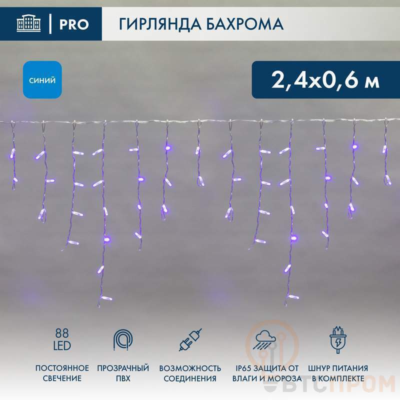 Гирлянда 'Бахрома' ('Айсикл') представляет собой гибкий горизонтальный шнур-шину, к которому через определенные промежутки крепятся вертикальные нити разной длины со светодиодами. Она имитирует сосульки и может послужить эффектным и оригинальным решением при декорировании карнизов домов, арок, фасадов зданий, витрин магазинов, а также стать элементов декора внутренних интерьеров помещений. Благодаря использованюя в гирлянде светодиодов, ее отличительной особенностью является превосходная яркость и низкое энергопотрбление по сравнению с лампами накаливания. При длине 2,4 метра гибкая направляющая имеет 24 вертикальные нити от 20 до 60 см.Данная гирлянда имеет Синий цвет свечения и предназначена для использования как внутри помещения, так и снаружи.