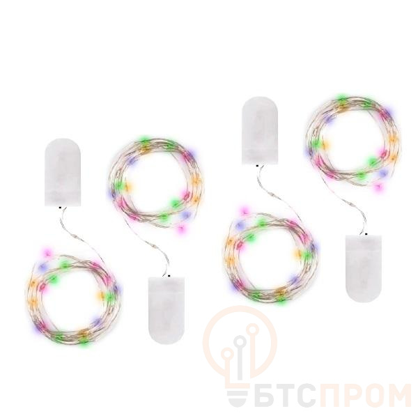 Гирлянда DC-G05-20MS4 (артикул 5048058). Комплект из 4 гирлянд. Каждая на 20 RGB-светодиодов. Питание от 2 батареек CR2032 (в комплекте). Плоские батарейки-таблетки.