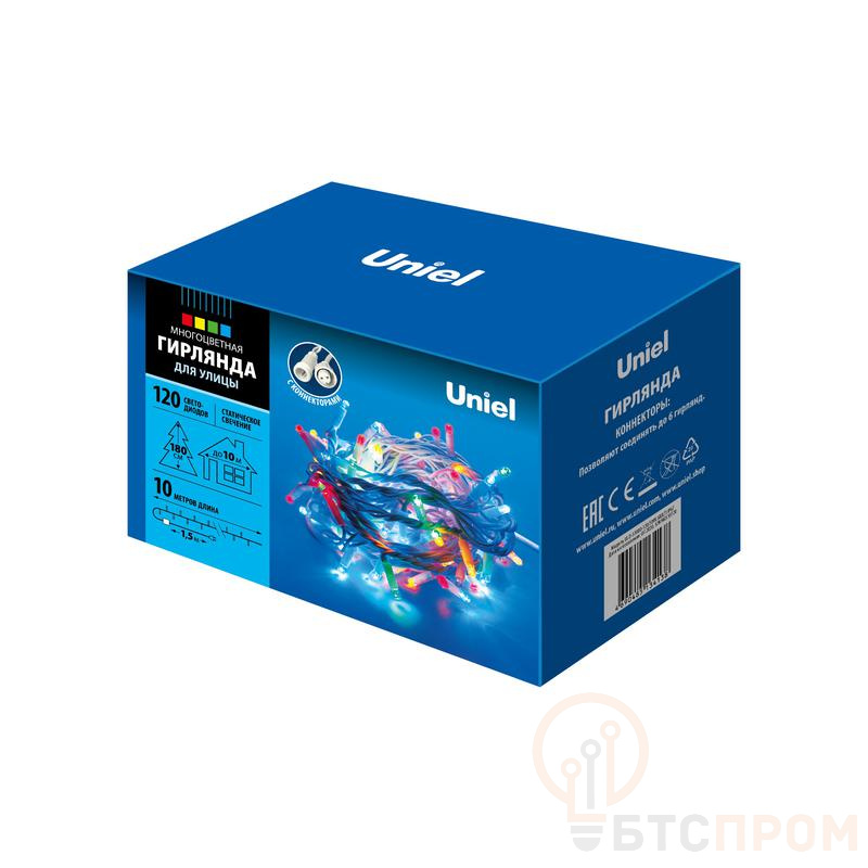 Гирлянда LED со статическим свечением ULD-S1000-120/SWK MULTI IP67 (артикул UL-00007202). Водонепроницаемая гирлянда длиной 10 метров со 120 разноцветными диодами. Статический свет. Белый провод. Соединяемая.