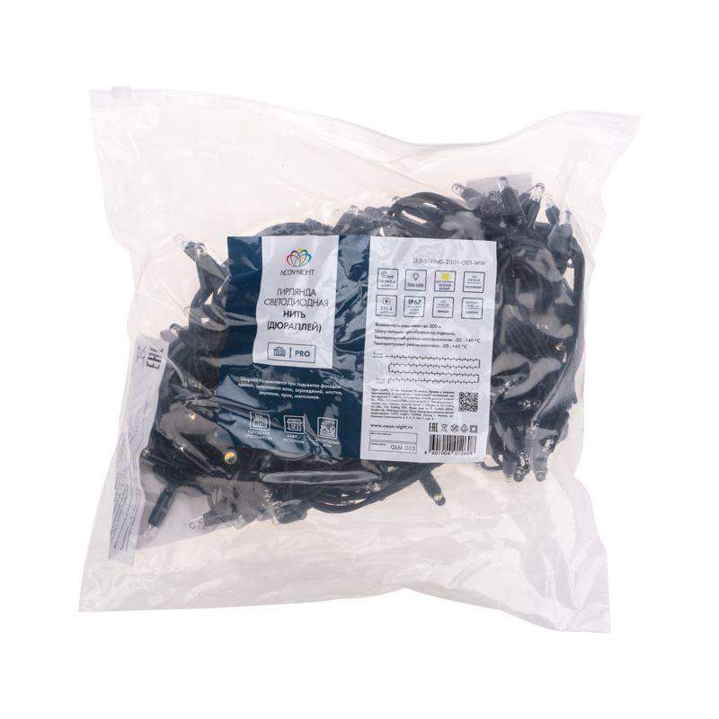 Гирлянда светодиодная "Нить" 20м 200LED тепл. бел. 18Вт 230В IP67 постоян. свечение провод каучук черн. (нужен шнур питания 315-000) Neon-Night 315-156