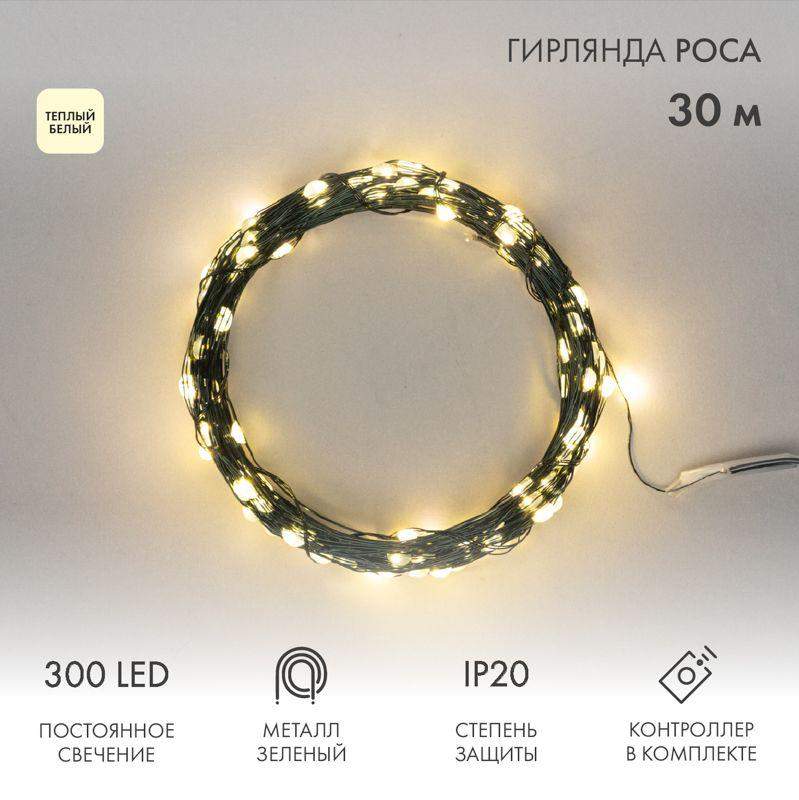 Гирлянда Роса длиной 30 метров представляет собой тонкий провод зеленого цвета, на котором горят и мерцают маленькие светодиоды, напоминающие капли росы. Благодаря своей универсальности гирлянда применяется для украшения любых предметом интерьера и используется для создания романтических образов на фотосессиях, свадьбах, днях рождениях и других праздниках. Отлично подходит для украшения новогодней елки. Роса излучает теплое белое свечение, которое создает уютную и приятную атмосферу в любом помещении. При работе гирлянда не нагревается, что делает ее абсолютно безопасной. Гирлянда имеет 8 режимов свечения. Оснащена трансформатором и контроллером, который позволяет выбирать необходимый режим работы.