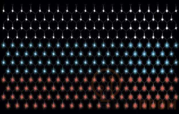 Гирлянда "Сетка Российский триколор" NTLD240-RT (артикул 4690601032614). Патриотичный вариант световой сетки размером 1.5х0.9 метра, состоящий из 240 светодиодов цветов российского флага: красный, синий, белый. С контроллером. Для помещений. Идеальна для оформления мероприятий в патриотической тематике, спортивных болельщиков или государственных праздников.