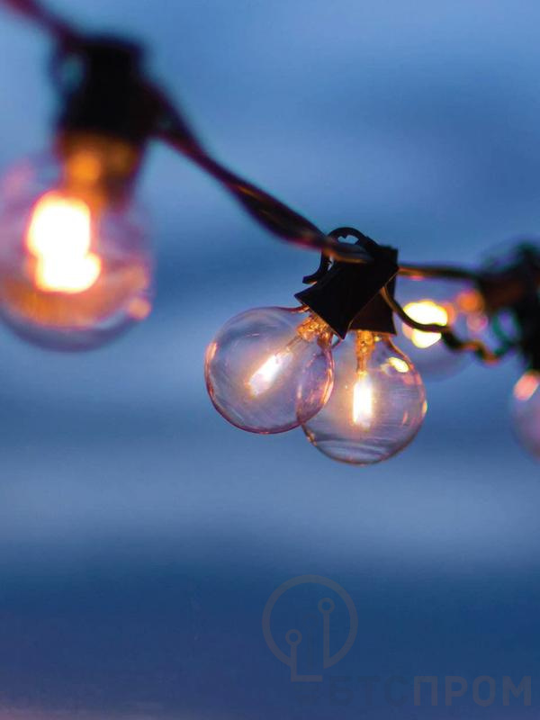 Водонепроницаемая уличная гирлянда с 10 светодиодными лампочками тёплого света в работе похожи на лампочки накаливания. Подходит для дачи, для освещения открытых площадок, веранд или уличных мероприятий. Длина световой части - 5м, шнур с вилкой - 2м, 10 светодиодных лампочек с шагом 50см, защита от пыли и влаги IP44