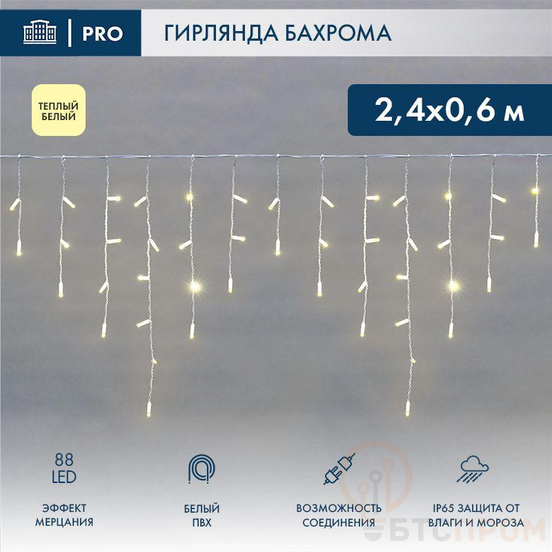 Гирлянда светодиодная "Айсикл" (бахрома) 2.4х0.6м 88LED тепл. бел. IP65 эффект мерцания 230В провод бел. (нужен шнур питания 303-500-1) Neon-Night 255-038