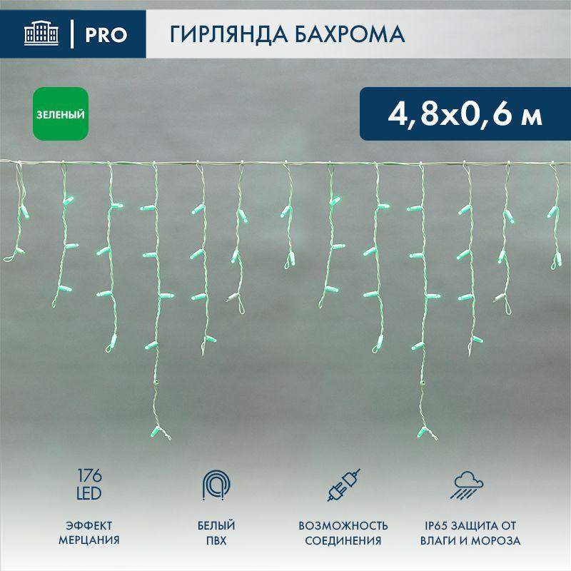 Гирлянда светодиодная "Айсикл" (бахрома) 4.8х0.6м 176LED зел. 15Вт 230В IP65 эффект мерцания провод ПВХ бел. (нужен шнур питания 303-500-1) Neon-Night 255-164