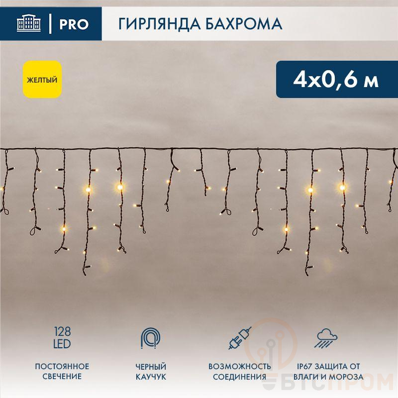 Гирлянда светодиодная "Айсикл" (бахрома) 4х0.6м 128LED желт. 10Вт 230В IP67 провод каучук черн. (нужен шнур питания 315-000) Neon-Night 255-221