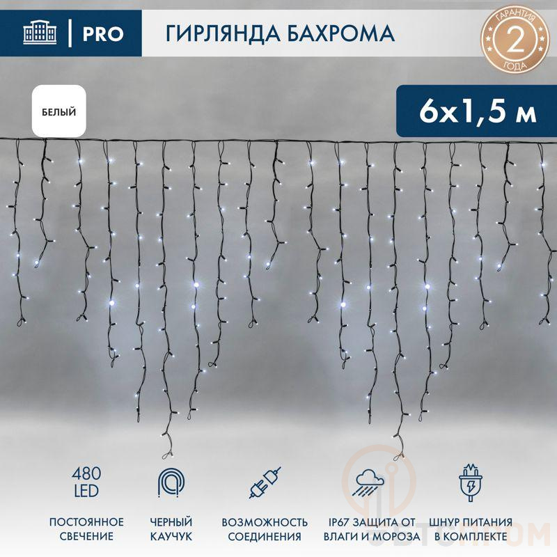 Гирлянда светодиодная "Айсикл" (бахрома) 6х1.5м 480LED бел. 33Вт 230В IP67 провод каучук черн. Neon-Night 255-295