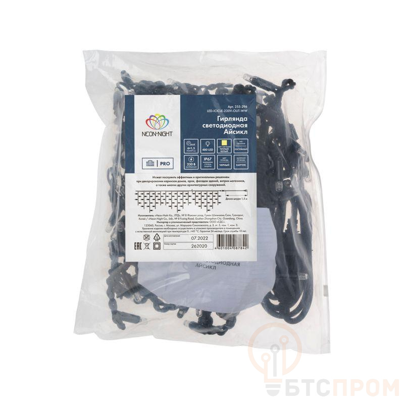 Гирлянда светодиодная "Айсикл" (бахрома) 6х1.5м 480LED тепл. бел. 33Вт 230В IP67 провод каучук черн. Neon-Night 255-296