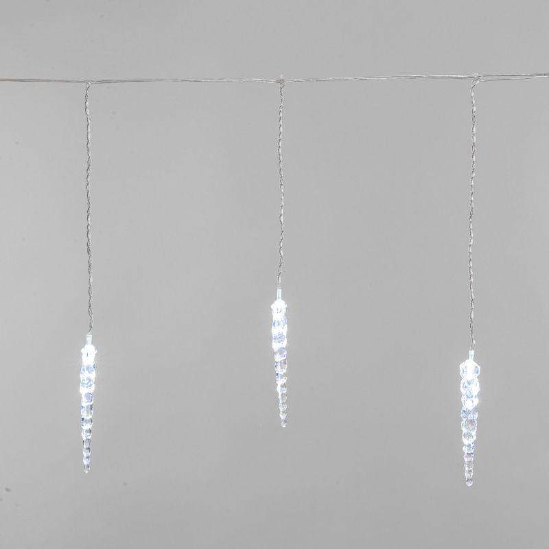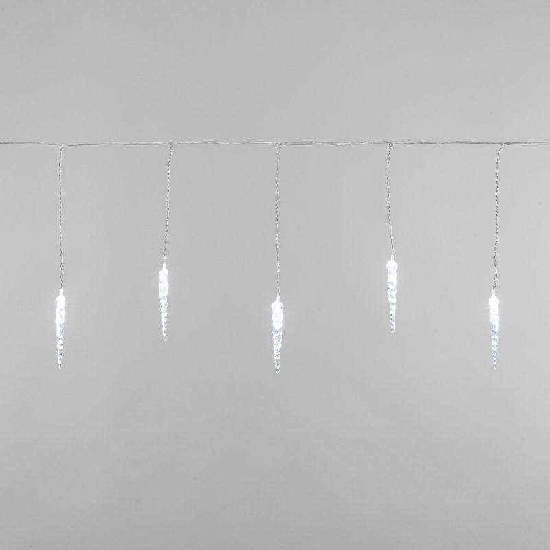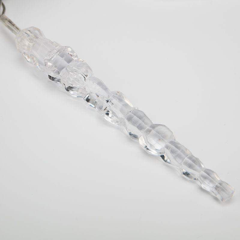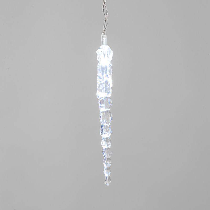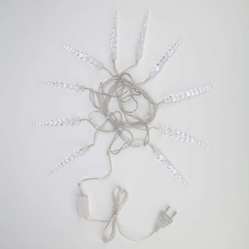Гирлянда «Сосульки» длиной 1,5 метра, выполнена в виде ассиметричных нитей: на проводе-основе находятся 10 вертикальных отрезков по 20 и 25 сантиметров, на которых размещены 10 ярких диодов белого свечения. Электрический кабель защищен от повреждений слоем эластичной изоляции из прозрачного ПВХ. 10 насадок в виде сосулек эффектно подсвечиваются диодами, имитируя сверкание настоящего льда. Для подключения к электрической сети не понадобится удлинитель: собственная длина питающего шнура составляет 3 метра.
