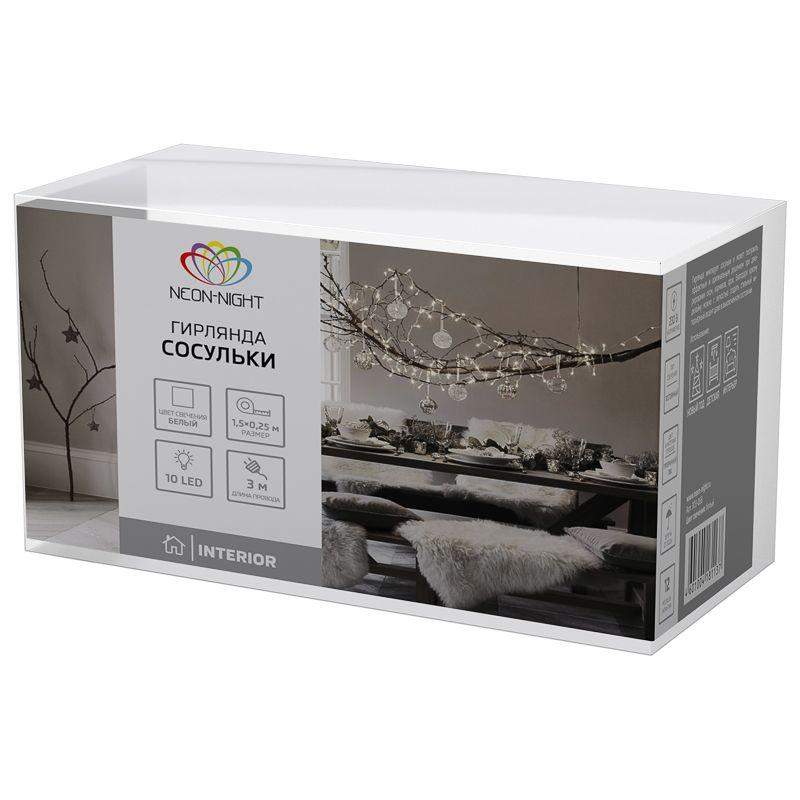 Гирлянда светодиодная "Айсикл" (бахрома) "Сосульки" 1.5х0.25м 10LED бел. 0.51Вт IP20 провод прозр. Neon-Night 303-068