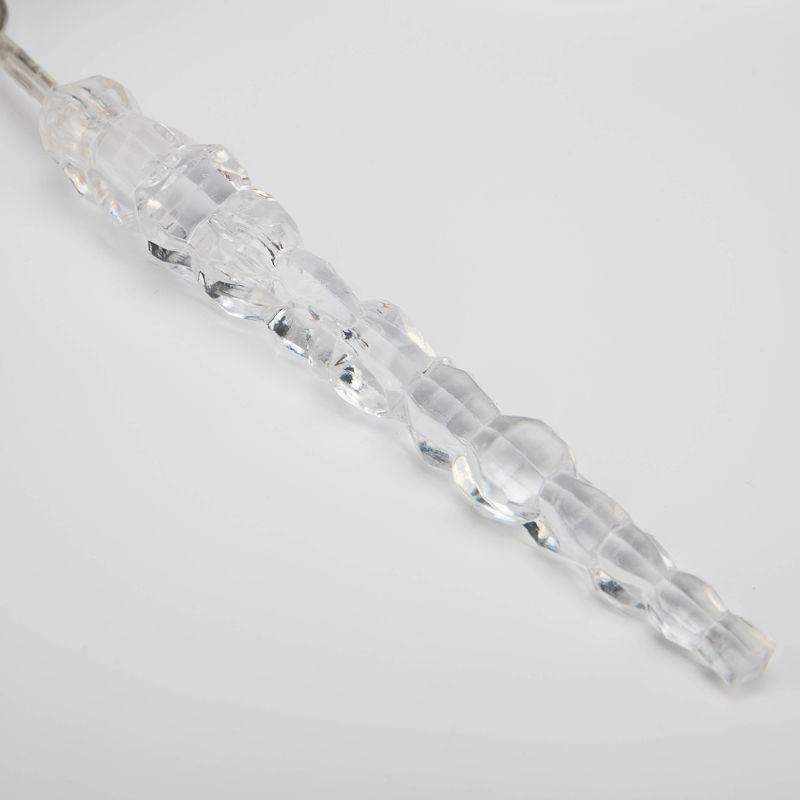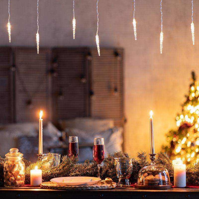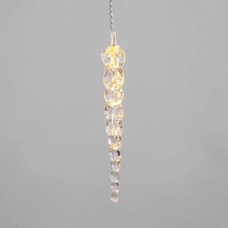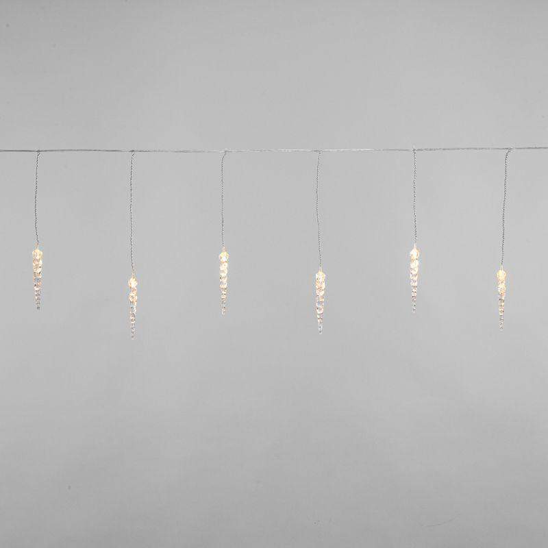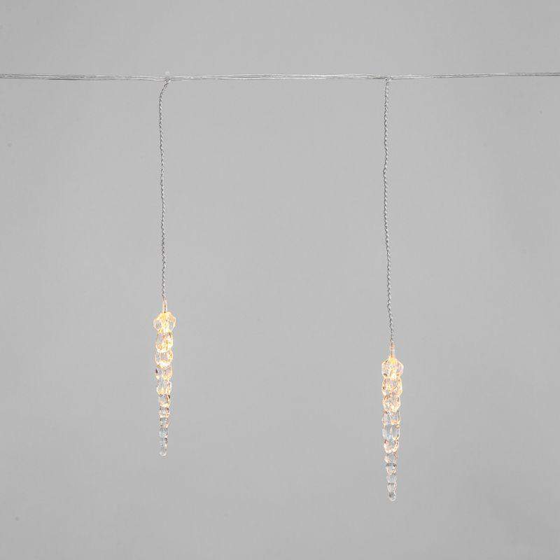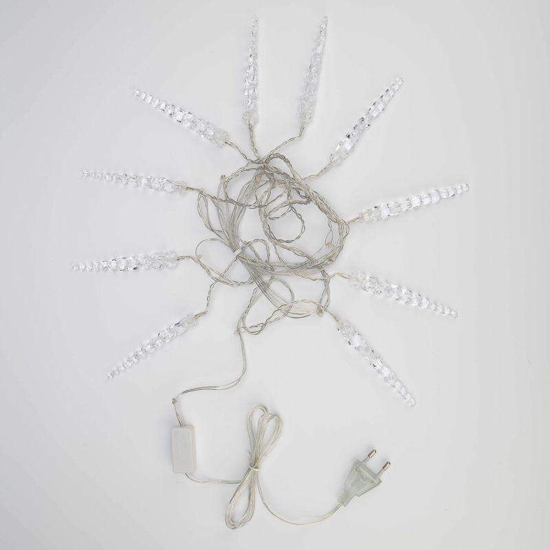 Гирлянда «Сосульки» длиной 1,5 метра работает в режиме постоянного свечения. Изделие выполнено в виде ассиметричных нитей 0,2–0,25 метра. Шнур в оболочке из прозрачного ПВХ служит основой для 10 диодов теплого белого свечения, которые скрываются внутри декоративных сосулек размером 11,5 см. Яркий свет играет в сосульках, создавая эффект сверкающего изнутри льда. Гирлянда с защитой IP20 питается от сети 230 В, для подключения к розетке предусмотрен трехметровый кабель.