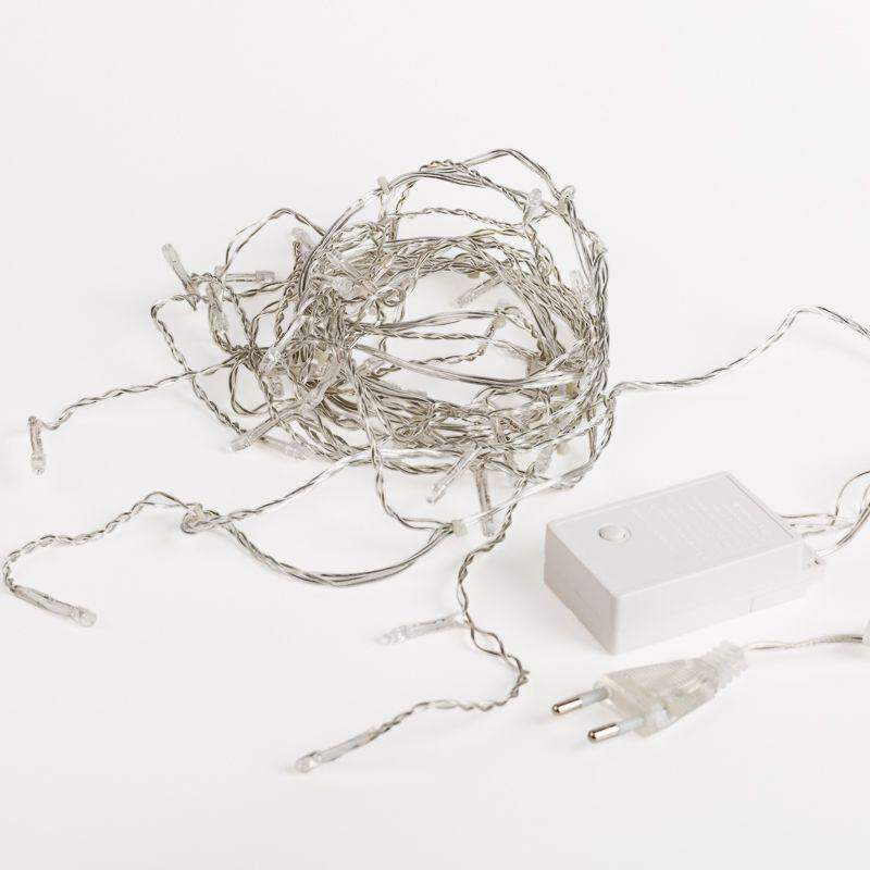 Светодиодная гирлянда «Айсикл» 1,8?0,5 м — оригинальное украшение для оформления гардин, ниш, открытых проемов между комнатами, которое выгодно подчеркнет элементы дизайна интерьера и отобразит индивидуальный вкус хозяев дома. Гирлянда выполнена в виде бахромы: на кабеле-основе расположены свисающие нити разной длины (от 10 до 50 см). Серебристый шнур в прозрачной оболочке из ПВХ практически незаметен на общем фоне и, подсвечиваемый 48 диодами, образует гармоничную яркую композицию. Контроллер на 8 режимов управляет ритмом свечения белых светодиодов.