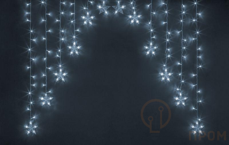 Гирлянда светодиодная "Бахрома" "Арка звезды" от Navigator (артикул 95033). Модель NGF-D038-01 представляет собой гирлянду-бахрому с тематическим дизайном "звезды", образующую готовую арку размером примерно 2.5х0.8 метра. Холодный белый свет (CW). IP20. Готовая арочная конструкция для украшения дверного проема или ниши.