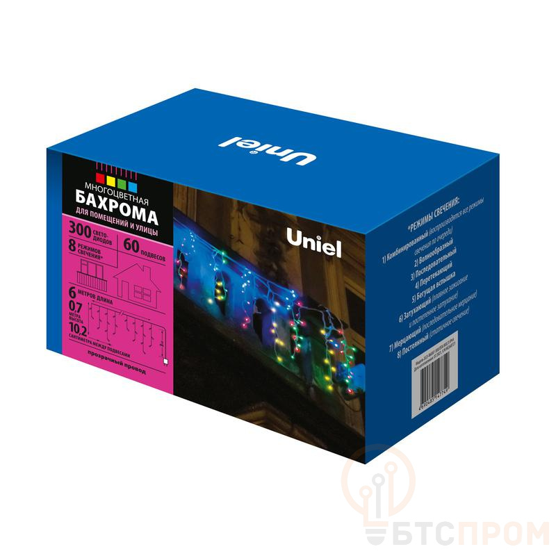 Гирлянда светодиодная "Бахрома" ULD-B6007-300/DTA MULTI IP44 6м 300LED мультиколор провод прозр. Uniel UL-00008556
