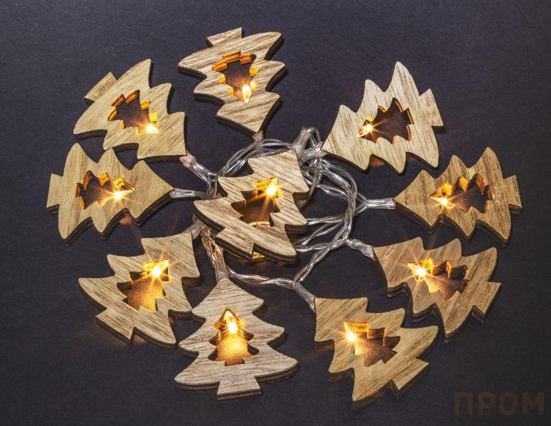 Гирлянда светодиодная "Деревянные елочки" (артикул 14046) модели NGF-D008-10WW-2AA. Беспроводная гирлянда с фигурками деревянных елочек. 10 теплых белых светодиодов. Питание от 2АА. Натуральный материал – дерево – добавляет экологичности и тепла.