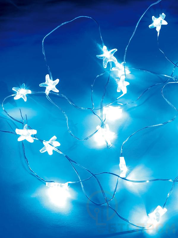 Гирлянда светодиодная "Голубые нити" (артикул KOCNL-EL114_blue). Длина 2 метра, 20 синих светодиодов. Насадки в виде синих звездочек. Питание от 3 батареек АА (не вкл.). Беспроводной вариант для гибкого декора.