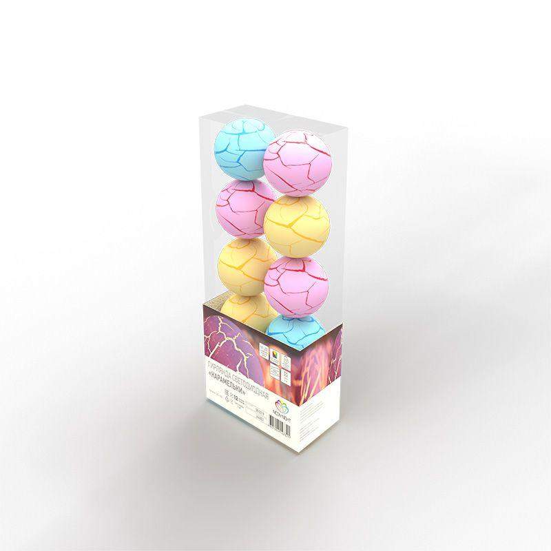 Светодиодная гирлянда «Карамельки» состоит из электрического шнура из прозрачного ПВХ, батарейного блока и 10 пластиковых разноцветных шариков, мягко подсвечиваемых 10 диодами. Поверхность фигурок с фактурой «кралекюр» пропускает яркие лучи, создавая магический эффект объемного свечения. Гирлянда не нуждается в прямом подключении к электросети и питается от двух батареек типа АА, что гарантирует абсолютную безопасность в использовании. Украшение прекрасно подходит для оформления гостиной, спальни, детской комнаты. Гирлянда работает в режиме постоянного свечения.