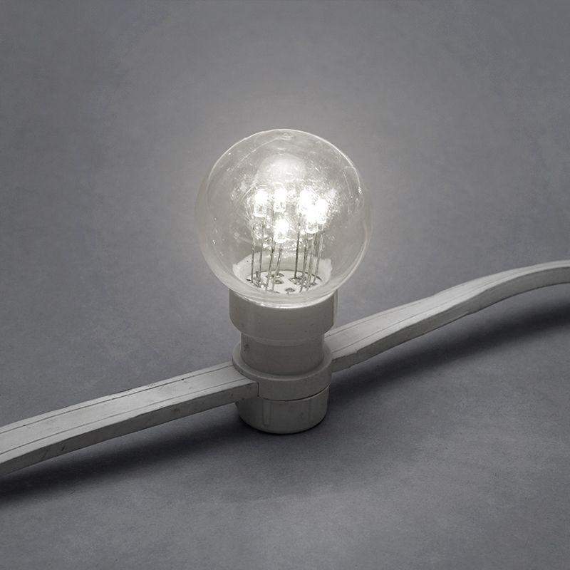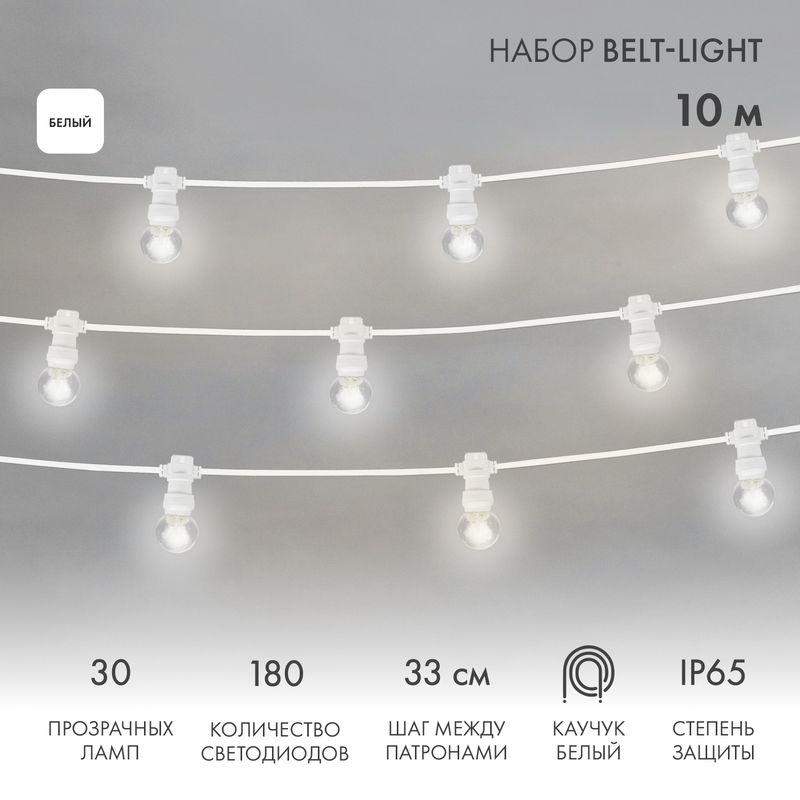 Специально подготовленный комплект LED Galaхy Bulb String состоит из гирлянды Belt Light длиной 10 м и 30 светодиодных ламп с диаметром 45 мм. Миниатюрные лампочки, уже установленные в патроны, излучают белый свет нейтрального оттенка в постоянном режиме. Электрический кабель с плоским сечением помещен в изоляционную оболочку из белого каучука. Полимер характеризуется гибкостью, прочностью, морозоустойчивостью — не теряет свои свойства при температуре до –40 °C. Защита по стандарту IP65 предполагает использование гирлянды как в помещениях, так и на улице.
