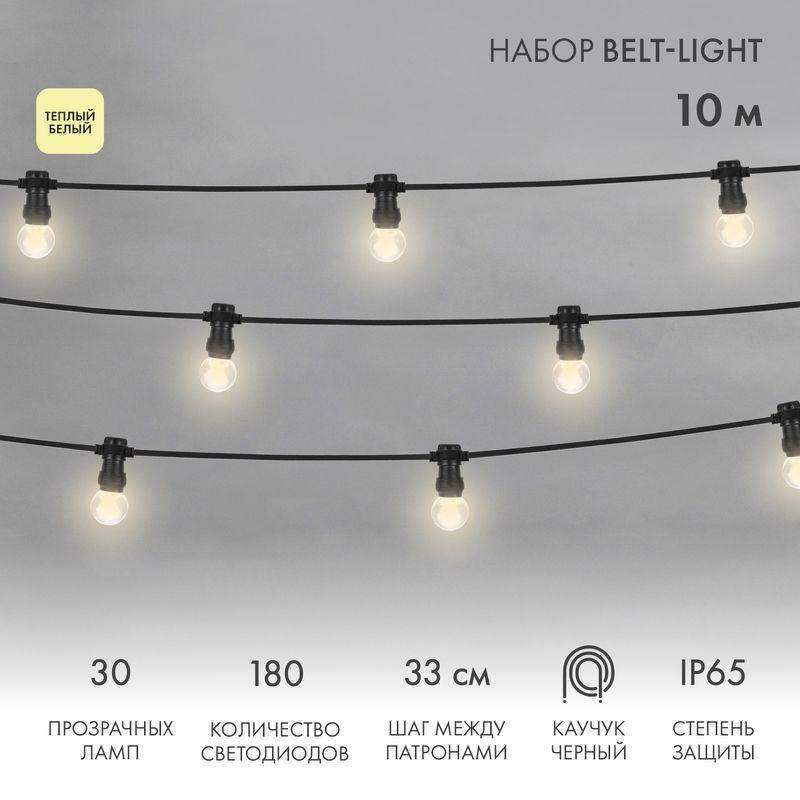 LED Galaxy Bulb String выполнена на основе гирлянды Белт-лайт и представляет собой готовый к использованию комплект. 30 светодиодных ламп уже установлены в патроны. В каждой лампе по 6 светодиодов. Элементы диаметром 4,5 см излучают белый свет теплого оттенка. Шина выполнена из электрического провода, заключенного в изоляционную оболочку из морозостойкого, гибкого и прочного каучука черного цвета. Длина провода составляет 10 метров. Гирлянда имеет защиту по стандарту IP65, поэтому подходит для размещения как дома, так и на улице. Диапазон рабочих температур –40...+40 °С.