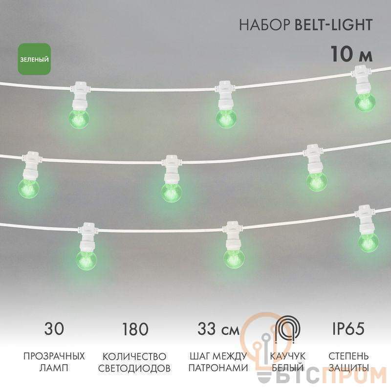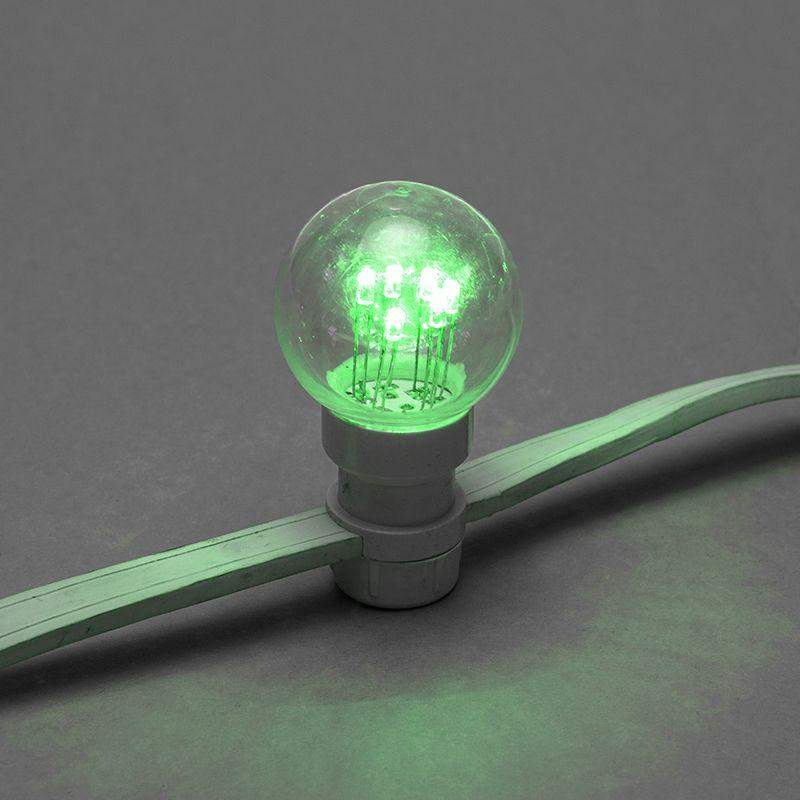 Готовый комплект LED Galaхy Bulb String длиной 10 метров состоит из гирлянды Белт-лайт со степенью пылевлагозащиты IP65 и 30 круглых светодиодных лампочек зеленого свечения. Элементы уже вкручены в патроны — остается только повесить декор и подключить его к электрической сети с напряжением 230 Вольт при помощи 1,5-метрового кабеля с вилкой. Лампы размещены с шагом 33 сантиметра на проводе, защищенном изоляционной оболочкой из белого каучука — прочного, морозостойкого, гибкого материала. На конце кабеля есть разъем для соединения с аналогичными изделиями, который позволяет получить гирлянду длиной до 100 метров.