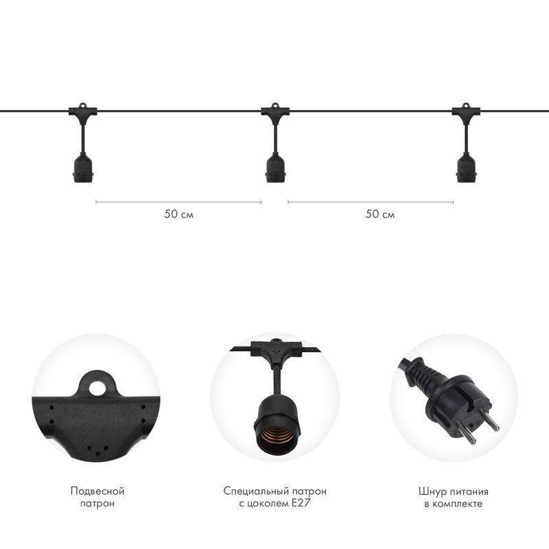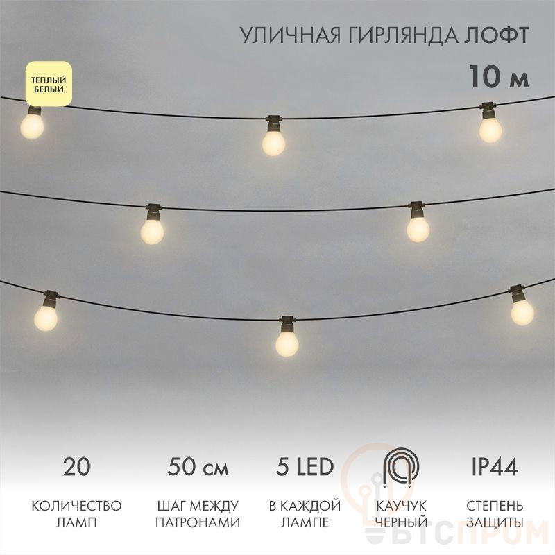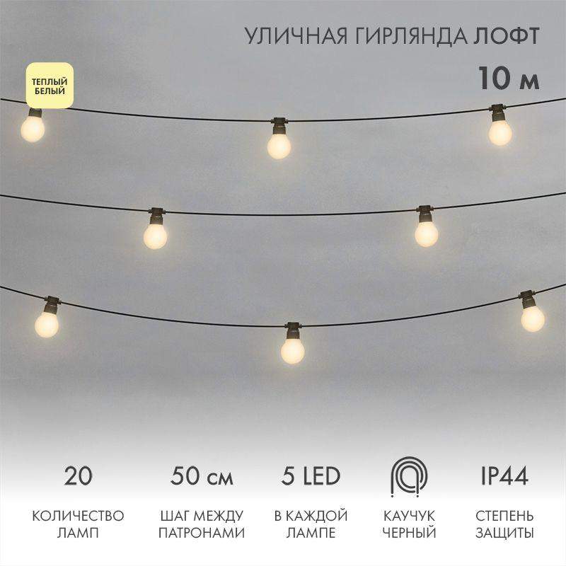 Уличная гирлянда «Лофт» выполнена на основе гирлянды «Белт-Лайт» и представляет собой готовый к использованию комплект, в котором уже установлены в патроны 20 матовых светодиодных ламп. В каждой лампе по 5 светодиодов. Изделие выполнено из электрического провода, заключенного в изоляционную оболочку из морозостойкого, гибкого и прочного каучука черного цвета. Длина провода составляет 10 метров. Гирлянда имеет защиту по стандарту IP44 – не боится попадания воды, поэтому подходит для размещения как дома, так и на улице. Диапазон рабочих температур –25...+40 °С.