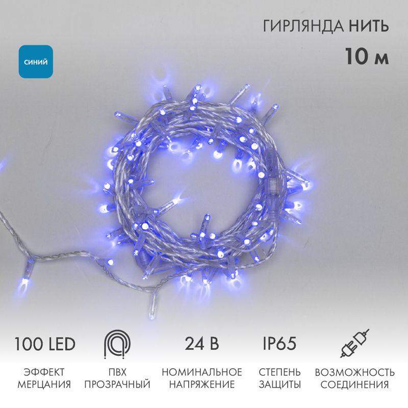 Гирлянда светодиодная "Нить" 10м 100LED син. 12Вт 24В IP65 эффект мерцания провод ПВХ прозр. Neon-Night 305-253