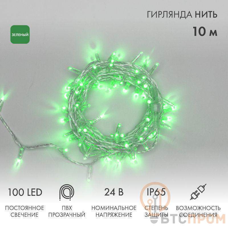 Гирлянда светодиодная "Нить" 10м 100LED зел. 8Вт 24В IP65 постоян. свечение провод ПВХ прозр. Neon-Night 305-154