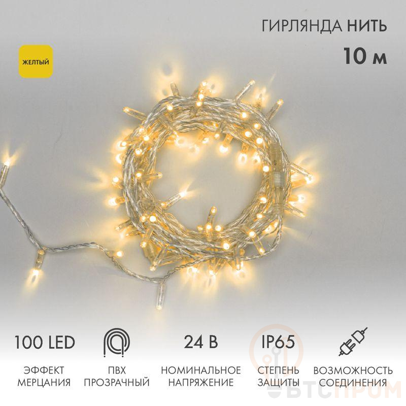 Гирлянда светодиодная "Нить" 10м 100LED желт. 12Вт 24В IP65 эффект мерцания провод ПВХ прозр. Neon-Night 305-251