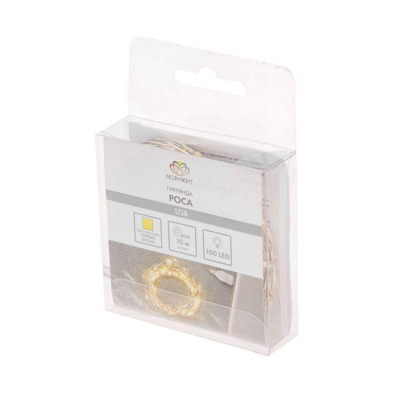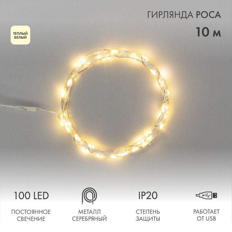 Светодиодная гирлянда «Роса» – прекрасный декоративный элемент, светящийся разными огоньками и создающий атмосферу праздника и уюта. Это отличный способ акцентировать внимание на отдельных предметах интерьера, создать неповторимый арт-объект или использовать в качестве дополнительной подсветки. Гирлянда может эффектно подчеркнуть красоту картины, вазы с цветами, статуэтки или украсить небольшую елочку. Часто «Роса» украшает не только интерьер, но и с успехом применяется на торговых площадках и ярмарках для привлечения внимания к продукции. Гирлянда состоит из тонкого провода длиной 10 метров, с расположенными на нем 100 теплыми белыми долговечными светодиодами. В качестве питания у данной модели гирлянды выступает USB-разъем, который крепится на дополнительный провод длиной 20 см. Создайте атмосферу праздника с помощью светодиодной гирлянды «Роса»!