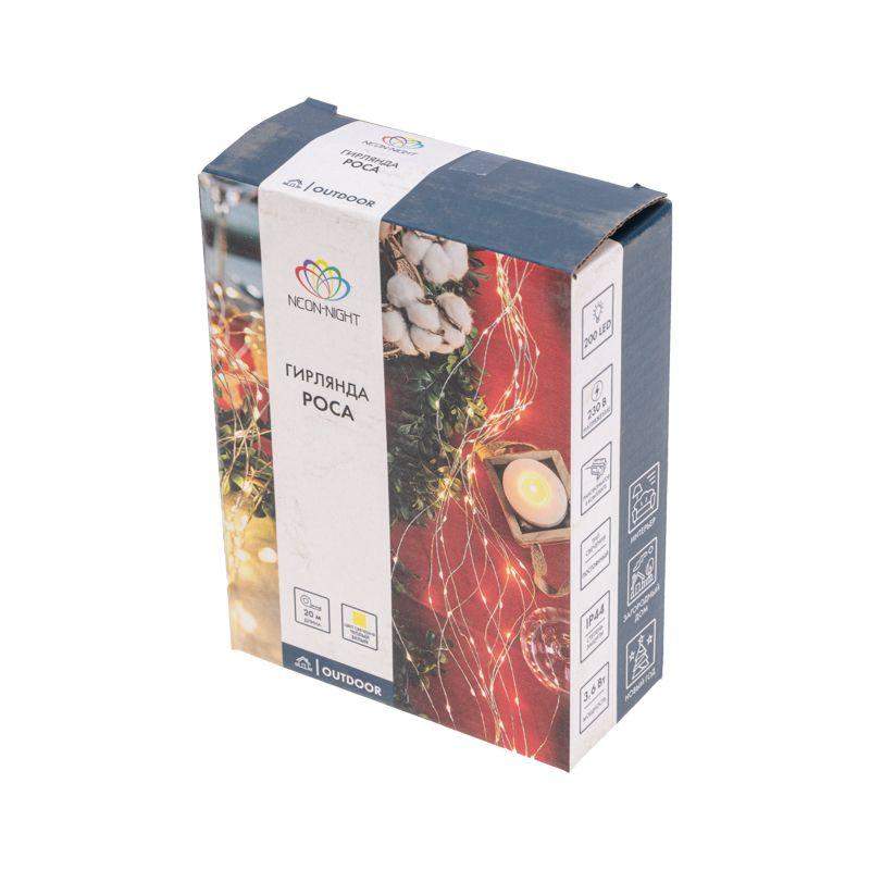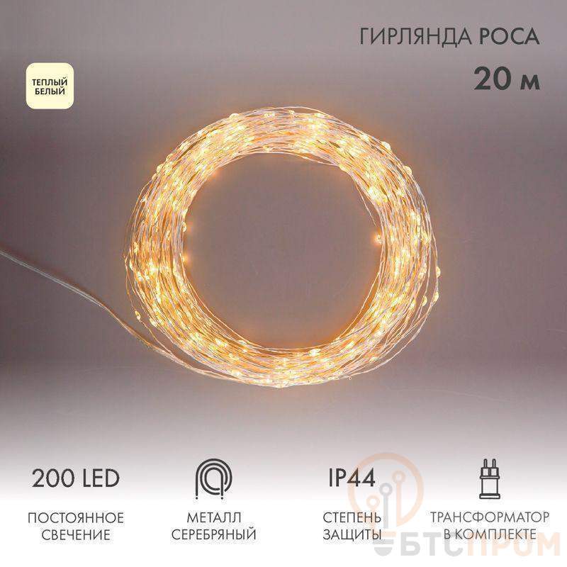 Гирлянда состоит из тонкого провода длиной 20 метров, с расположеннымии на нем 200 теплыми белыми долговечными светодиодами.