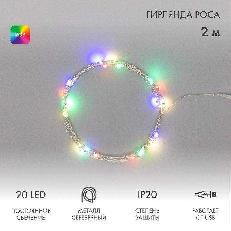 Светодиодная гирлянда «Роса» – прекрасный декоративный элемент, светящийся разными огоньками и создающий атмосферу праздника и уюта. Это отличный способ акцентировать внимание на отдельных предметах интерьера, создать неповторимый арт-объект или использовать в качестве дополнительной подсветки. Гирлянда может эффектно подчеркнуть красоту картины, вазы с цветами, статуэтки или украсить небольшую елочку. Часто «Роса» украшает не только интерьер, но и с успехом применяется на торговых площадках и ярмарках для привлечения внимания к продукции. Гирлянда состоит из тонкого провода длиной 2 метра, с расположенным на нем 20 разноцветными долговечными светодиодами. В качестве питания у данной модели гирлянды выступает USB-разъем, который крепится на дополнительный провод длиной 30 см. Создайте атмосферу праздника с помощью светодиодной гирлянды «Роса»!
