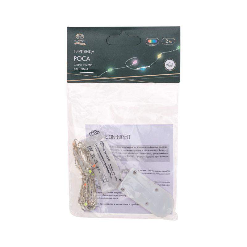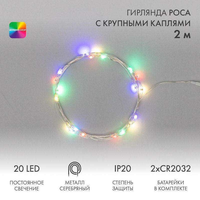 Гирлянда светодиодная "Роса" с крупными каплями 2м 20LED мультиколор 0.1Вт IP20 тонкий батарейный блок элементы питания 2хCR2032 (в компл.) Neon-Night 302-009