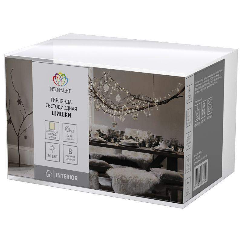 Гирлянда светодиодная "Шишки" 5м 30LED тепл. бел. 1.8Вт IP20 с контроллером 8 режимов провод ПВХ прозр. Neon-Night 303-069