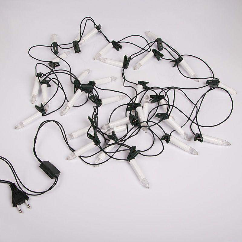 Гирлянда «Свечи» длиной 10 метров — это настоящий символ Рождественских праздников, который станет оригинальным украшением ели, создаст атмосферу уюта и ощущение волшебства. 50 диодов располагаются в фигурках в виде свечек, которые излучают теплый белый свет и имитируют пламя. Элементы находятся на проводе, защищенном изоляцией из темно-зеленого ПВХ, и сопровождаются клипсами-фиксаторами. Небольшие пластиковые зажимы помогают закрепить фигурки на ветвях новогодней елки в нужном положении. Зеленый шнур отлично маскируется в кроне, оставляя на виду только горящие свечи. Для подключения в розетку не требуется удлинитель: длина питающего шнура 3 метра.