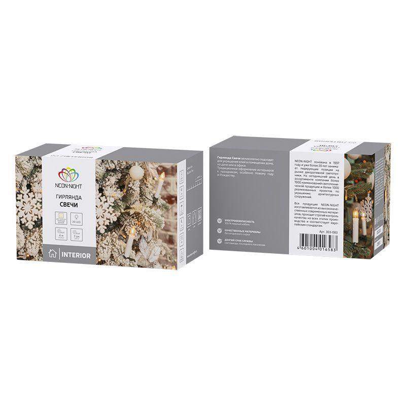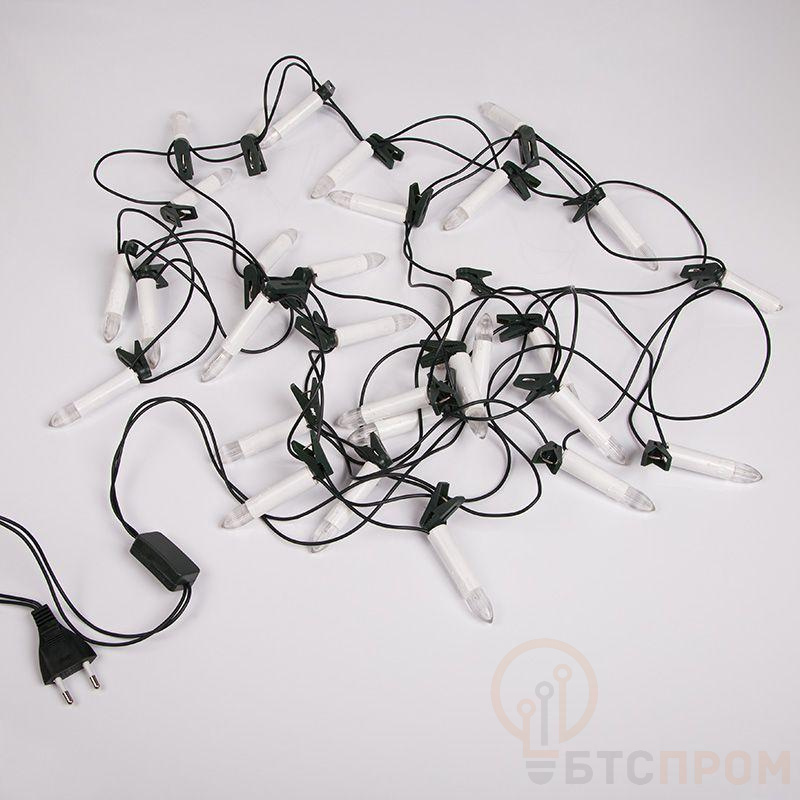 Гирлянда «Свечи» выполнена в виде провода в изоляционной оболочке из темно-зеленого ПВХ длиной 4 метра, на котором расположены 20 фигур в виде свечей со светодиодами, размер свечи — 7 см. Диоды излучают белый свет теплого оттенка, имитирующий пламя на кончике фитиля. Каждая свечка сопровождается пластмассовой клипсой-прищепкой, которая позволяет закрепить фигурки на ветках новогодней ели в нужном положении. Для подключения в розетку в любом удобном месте предусмотрен трехметровый электрический кабель. Гирлянда светится в постоянном режиме.