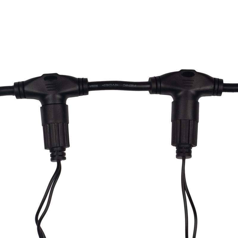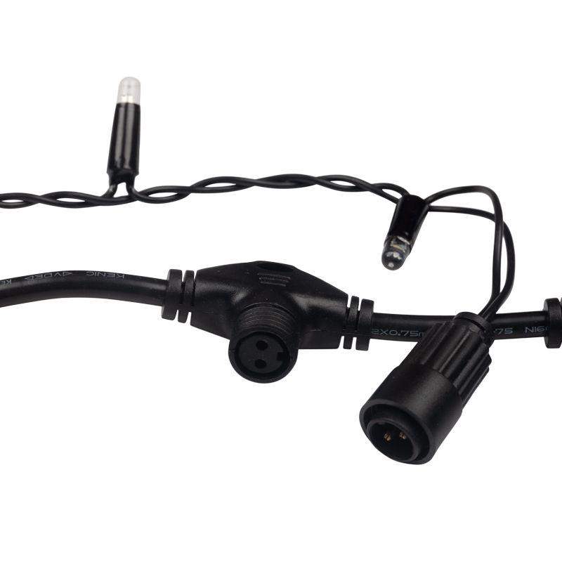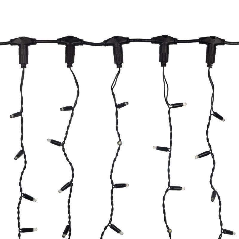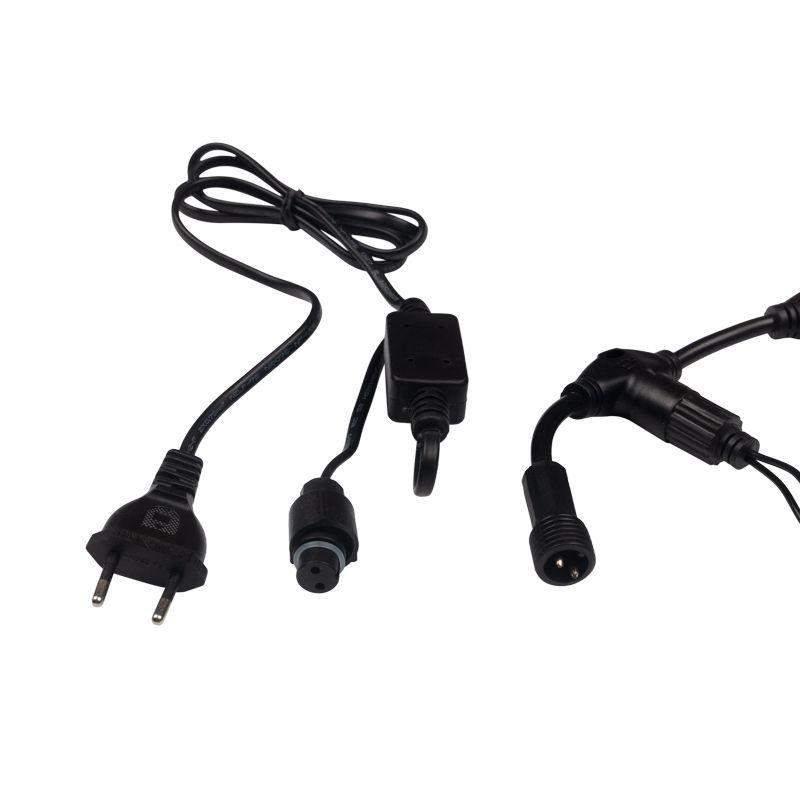 Гирлянда "Светодиодный Дождь" представляет собой гибкий горизонтальный шнур-шину (2м), к которому через определенные промежутки крепятся вертикальные нити (20 шт.) со светодиодными лампами, которые отличаются от «Бахромы» тем, что имеют одинаковую, достаточно значительную длину, часто превышающую протяженность шины. На концах каждой шины есть разъем и штепсель, которые предназначены для последовательного соединения нескольких световых дождей в большой занавес ПЛЕЙ-ЛАЙТ. Используя занавес, можно не только создавать красивые световые занавесы или оформлять различные плоскости, например, фасады домов, окна и т.д., но и украшать объемные объекты. Гирлянду, работающую в непрерывном свечении, называют фиксинг, а использующую режим светодинамики – чейзинг. Режим чейзинг имеет различные светодинамические эффекты. Данная гирлянда имеет эффект мерцания. Сегодня в гирляндах источником света служат светодиоды, которые пришли на смену применявшимся ранее лампам накаливания. С полупроводниковыми источниками гирлянда стала более надежной, потребляет меньше энергии, обрела более насыщенное сияние. Данная гирлянда имеет синий цвет свечения светодиодов.