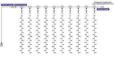 Гирлянда "Светодиодный Дождь" представляет собой гибкий горизонтальный шнур-шину (2м), к которому через определенные промежутки крепятся вертикальные нити (20 шт.) со светодиодными лампами, которые отличаются от «Бахромы» тем, что имеют одинаковую, достаточно значительную длину, часто превышающую протяженность шины. На концах каждой шины есть разъем и штепсель, которые предназначены для последовательного соединения нескольких световых дождей в большой занавес ПЛЕЙ-ЛАЙТ. Используя занавес, можно не только создавать красивые световые занавесы или оформлять различные плоскости, например, фасады домов, окна и т.д., но и украшать объемные объекты. <br />