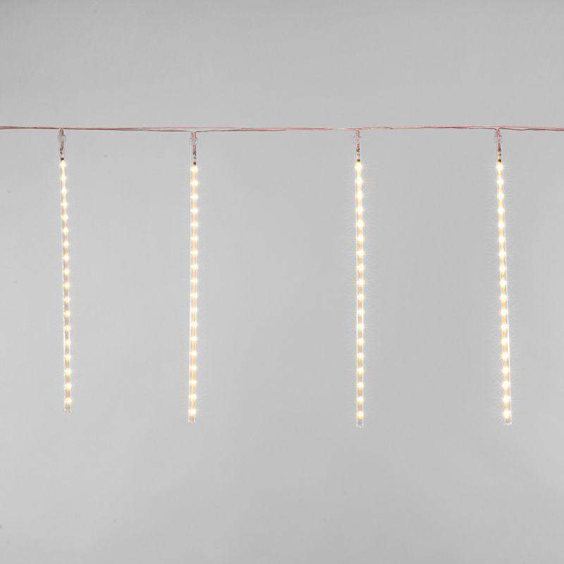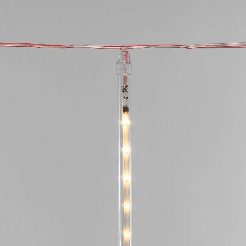Гирлянда «Тающие сосульки» — это необычное светодиодное украшение, которое представляет собой серебристый провод в прозрачной оболочке из ПВХ, с расположенными на нем 8 декоративными элементами в виде сосулек. Каждая трубка имеет длину 50 см и содержит внутри плату с диодами, управляемую микрочипом. Светодинамический эффект имитирует стекающую каплю. Гирлянда обладает защитой IP20 и подходит для использования в помещениях с естественной влажностью. Длина питающего шнура — 1.5 метра. Для подключения в сеть с напряжением 230 В