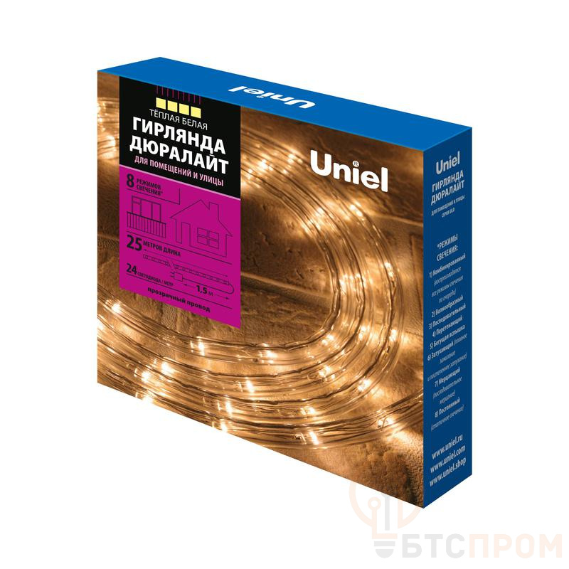 Гирлянда светодиодная ULD-D50 25M/С08 IP44 WARM WHITE Дюралайт 25м с контроллером тепл. бел. свет. провод бел. Uniel UL-00008575