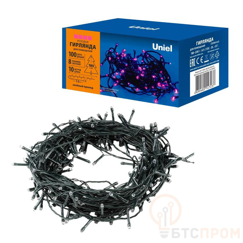 Гирлянда светодиодная ULD-S1000-100/DGA PINK IP20 от Uniel длиной 10 метров со 100 розовыми светодиодами. Зеленый провод. Розовый свет создает нежную, романтическую и немного игривую атмосферу. Идеал для девичников, свадеб, украшения спален, бутиков одежды или цветочных магазинов. Степень защиты IP20. Питание от 220 В. Длина позволяет создавать объемные драпировки. Статичное свечение. Качество и привлекательный дизайн.