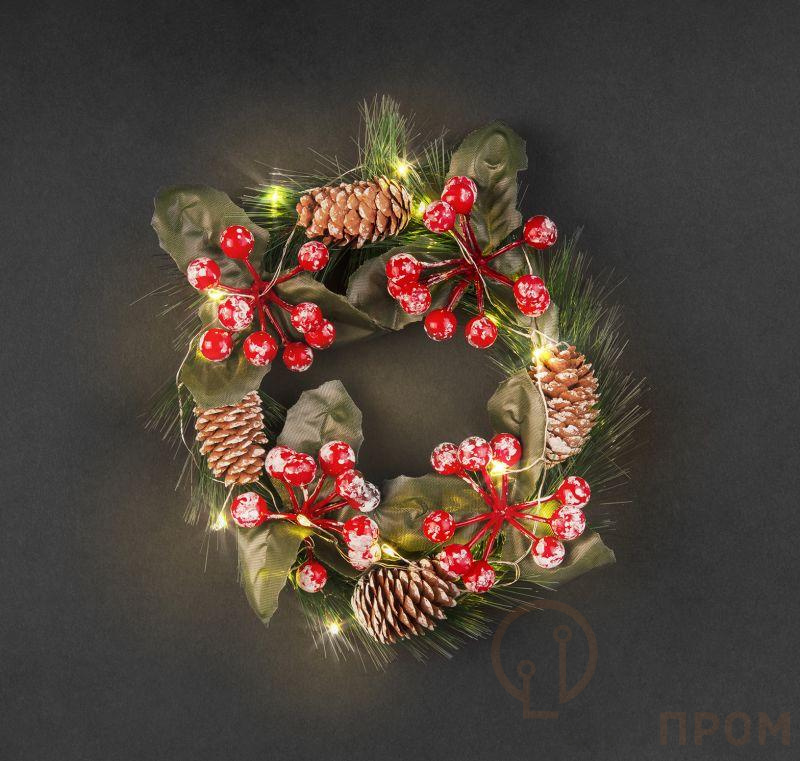 Гирлянда светодиодная "Венок шишки и ягоды" (артикул 95035) модели NGF-D041-01. Это, вероятно, гирлянда для украшения рождественского венка или имеющая форму венка. Теплый белый свет (WW).