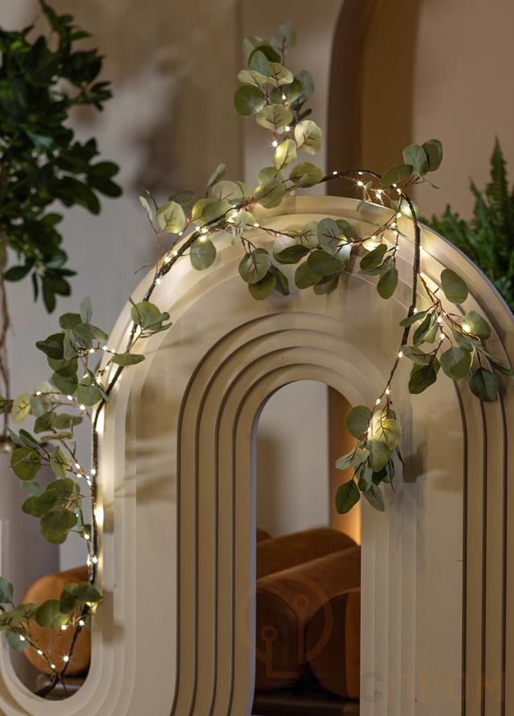 Интерьерное украшение ГИБКАЯ ВЕТВЬ ЭВКАЛИПТА KOC_INT-B127 длиной 1,8 метра вернет вас в атмосферу отдыха и релакса в далеких жарких странах. Наполнит помешение уютом и теплом. Листья тканевые, реалистично зеленые, ветви темно-коричневые, держат форму, незаметно оплетены тончайшей гирляндой в тон ствола с 96 светодиодами. Украшение работает от 3х батарек АА и имеет батареечный отсек IP44 с защитой от воды. Благодаря этому Вы можете украсить интерьер в доме, на веранде или в саду. Лиану можно сгибать, придавать разные формы и создавать стильные композиции.