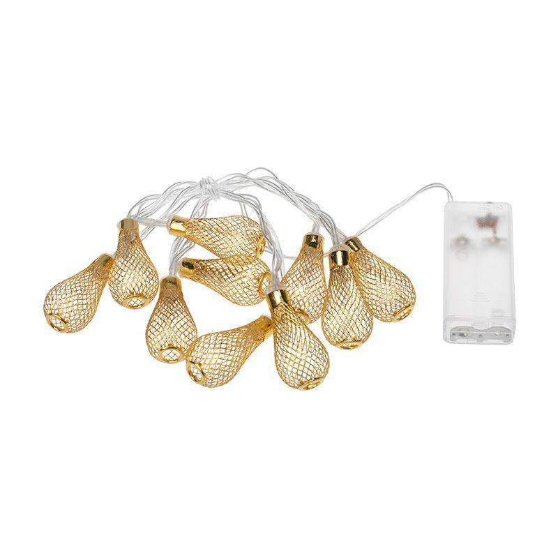 Светодиодная гирлянда «Восточные фонарики» длиной 1,5 метра представляет собой серебристый гибкий провод в защитной оболочке из прозрачного ПВХ, на котором находятся 10 ажурных золотистых фонариков. Внутри каждой насадки располагается яркий диод, излучающий теплый белый свет. Гирлянда имеет батарейный блок на конце электрического кабеля и питается от двух батареек типа АА. Независимость от розетки открывает большие возможности в области создания оригинального светового декора помещений. Изделия на батарейках абсолютно безопасны в использовании, поэтому их можно размещать даже в детских комнатах.