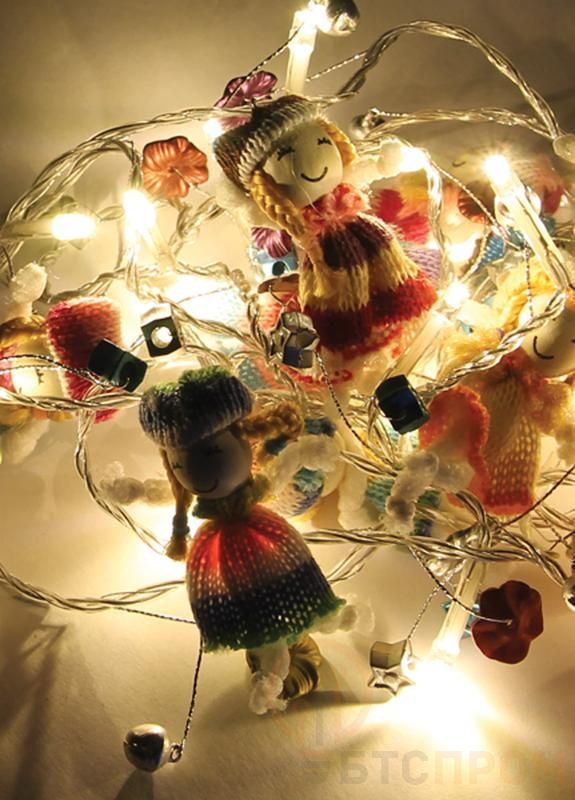 Гирлянда светодиодная "Вязанные куклы" от КОСМОС (артикул KOCNL-EL127). Гирлянда состоит из 10 светодиодов, встроенных в фигурки вязаных кукол. Питание от 2 батареек АА (не входят в комплект). IP20. Очень милый и handmade-вариант для детской комнаты или для создания по-настоящему домашней, рукотворной атмосферы.