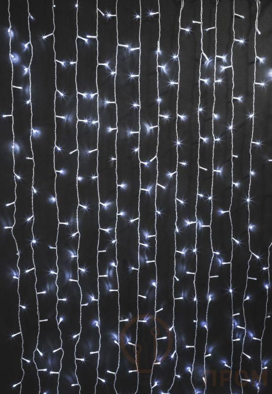 Уличная гирлянда «занавес». Размер: 5 х 2,5 метра (общая длина 6.5 м.) Количество светодиодов: 400 шт. Расстояние между светодиодами: 8 см Соединение в линию: до 5 гирлянд Тип провода: морозостойкий, прозрачный ПВХ