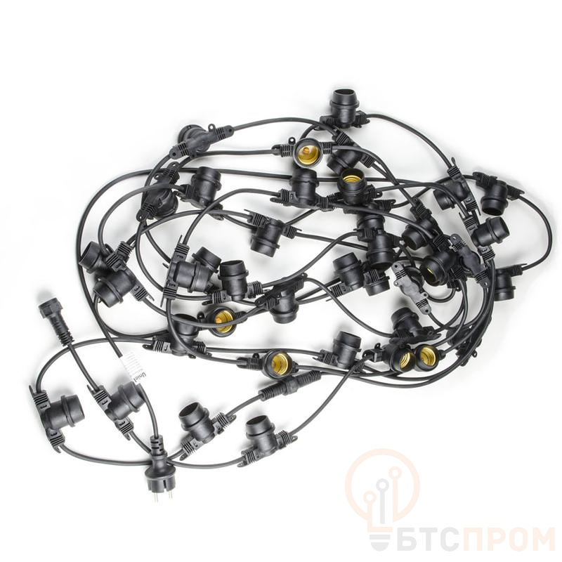 Гирлянда UDL-K110 40/E27/10M IP65 BLACK BELT-LIGHT от Uniel (артикул UL-00006440). Профессиональная гирлянда с патронами ("Белт-Лайт"). Длина 10 метров + 1.5 м сетевой шнур. 40 патронов E27 с шагом 25 см. Полная защита IP65. Черный провод. Для постоянного уличного использования с лампами накаливания или светодиодными лампами.
