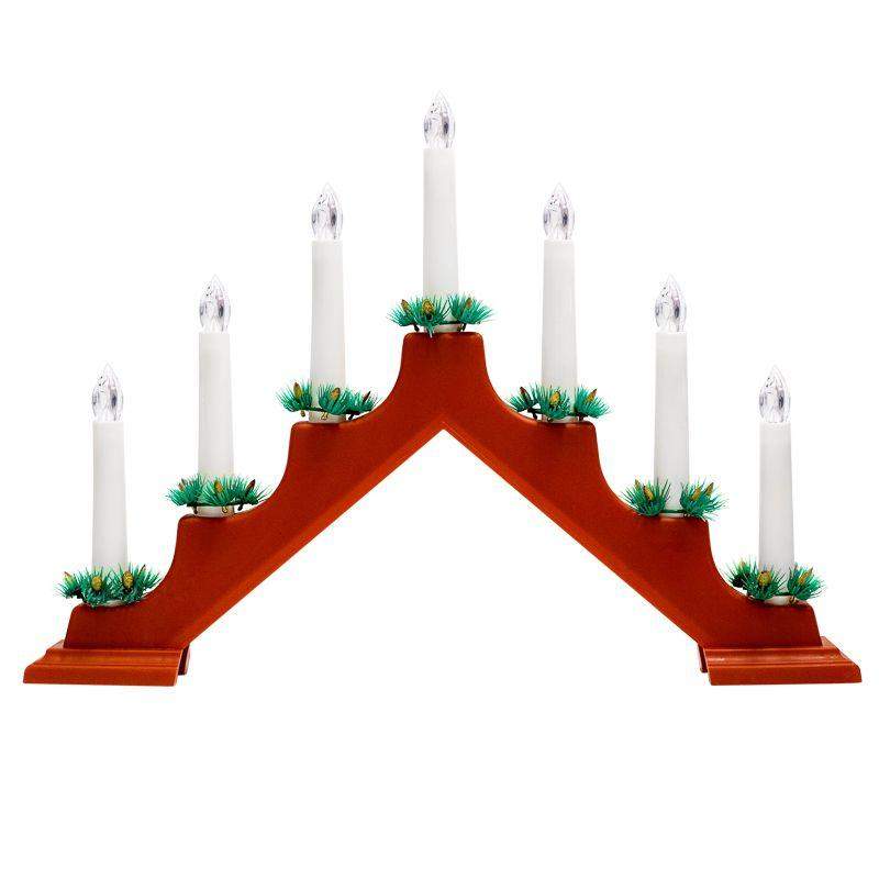Новогодняя горка красного цвета с 7 свечками гармонично украсит интерьер, создаст атмосферу уюта, тепла и комфорта. Декор в виде подсвечника поможет эффектно оформить праздничный стол, при этом не нужно опасаться возгорания или капающего воска – пластиковые свечки излучают теплый белый свет при помощи безопасных диодов. Они не нагреваются, служат долгое время и экономно расходуют электроэнергию. Сетевой кабель длиной 1,5 метра позволяет подключить горку в любом удобном месте – удлинитель не потребуется.
